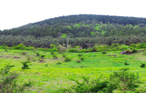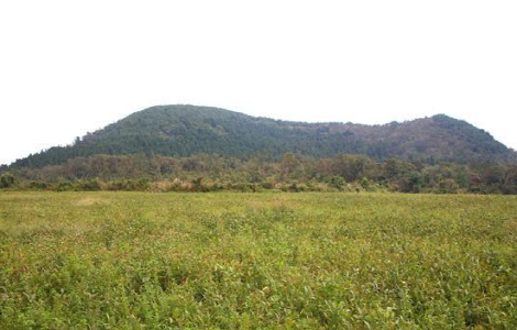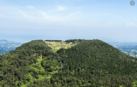 5.16 도로에서 산천단을 지나면 우측에 우뚝선 오름으로, 정상에는 풀밭의 산정분화구를 이루고 있으며, 화구 안부의 일부사면에는 묘들이 산재되어 있다.