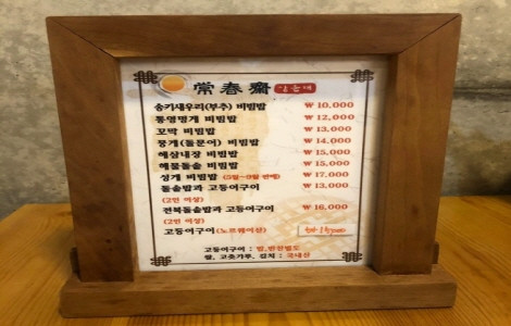 ‘상춘재’는 원래 청와대 안에 위치한 한옥건물로 외빈이나 주요 손님을 접견하는 곳이다. 이 상춘재를 식당 이름으로 내세운 곳이 있는데, 알고 보니 전 대통령을 세 사람이나 모셨던 청와대 출신 요리사가 운영한다. 이곳의 대표메뉴는 비빔밥이다. 원래는 아라동에 있었다. 현재 위치인 조천으로 2016년에 이사오면서 아라동 시절에 했던 메뉴인 추어탕을 빼고 통영멍게, 새꼬막, 돌문어 등을 넣은 해물비빔밥 전문으로 메뉴를 전문화시켰다. 매일 새벽 세시 반부터 일어나 음식 준비를 시작하고 청와대에서 귀빈을 대접하는 그 마음 그대로 비빔밥을 정성스럽게 담았다. 누구나 인정할 수밖에 없는 고품격 있는 비빔밥 전문집. 상호가 부끄럽지 않다.
