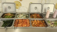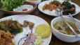여러가지 한식위주의 반찬들과 국,밥,쌈채소 등이 준비되어 있지만