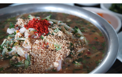 된장으로 맛을 내는 제주식 물회 전문점입니다. 보목포구에 있는데요. 야외 자리에서 숲섬과 제주바다가 한눈에 펼쳐지지요. 해녀들이 잡은 싱싱한 생선을 재료로 한 물회, 생선구이, 매운탕이 준비되어 있습니다.