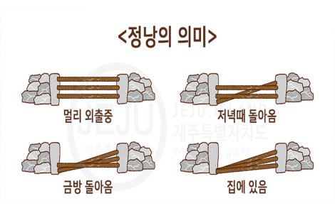 제주도의 전통 가옥에서 대문 역할을 하는 것으로, 대문 위치에 세운 큰 돌 혹은 나무(정주석, 정주목) 사이에 걸쳐 놓은 기둥을 말한다. 이 지역의 사람들은 정낭의 모양으로 집주인의 소재를 알 수 있었는데, 아래 그림과 같이 정낭 3개가 가로로 모두 걸쳐진 것은 '좀 멀리 갔어요', 2개가 걸쳐진 것은 '저녁때 쯤와요', 1개만 걸쳐진 것은 '금방 돌아와요', 한 개도 걸쳐있지 않은 것은 '사람 있어요'를 의미한다.